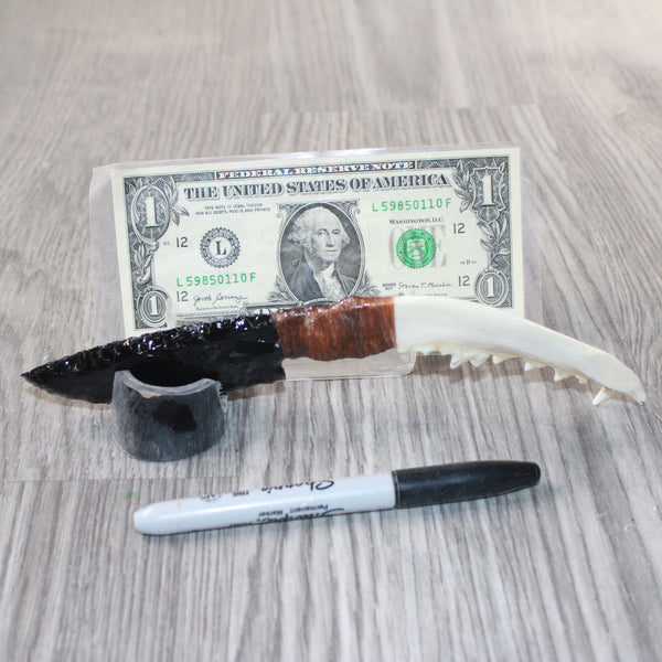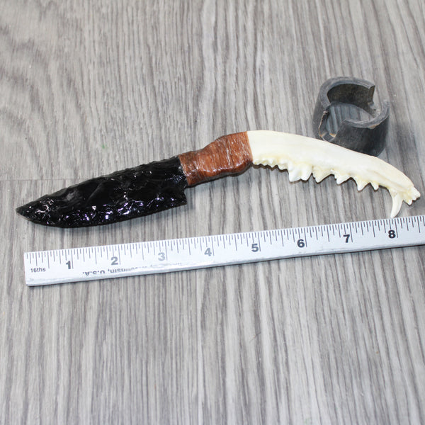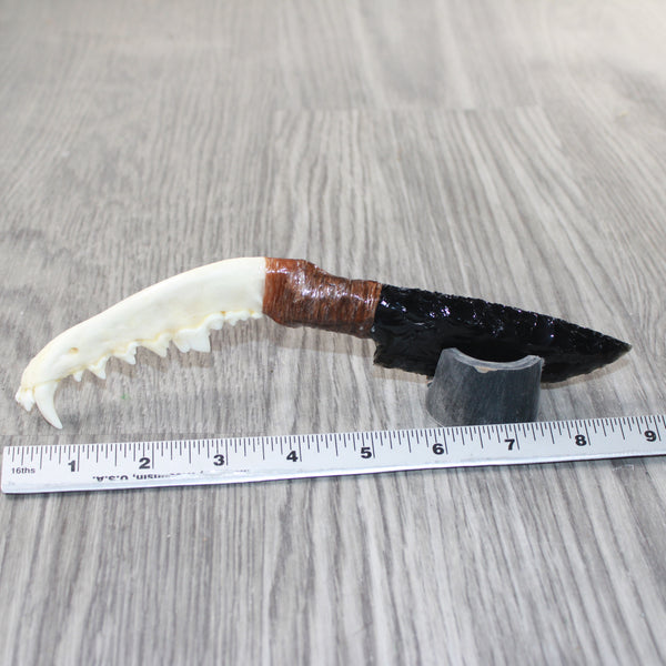 The handle is made from a coyote jawbone.